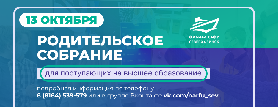 Филиал САФУ в Северодвинске приглашает родителей абитуриентов на первое крупное мероприятие в новой приёмной кампании 2023 года — родительское собрание для поступающих на программы высшего образования филиала САФУ в г. Северодвинске!