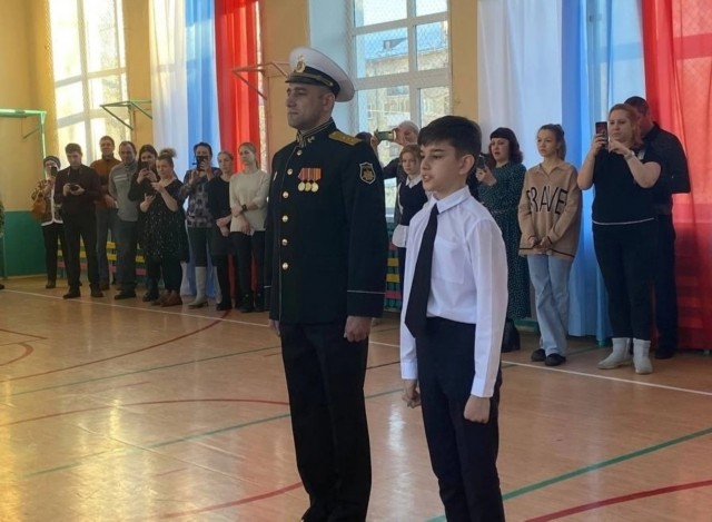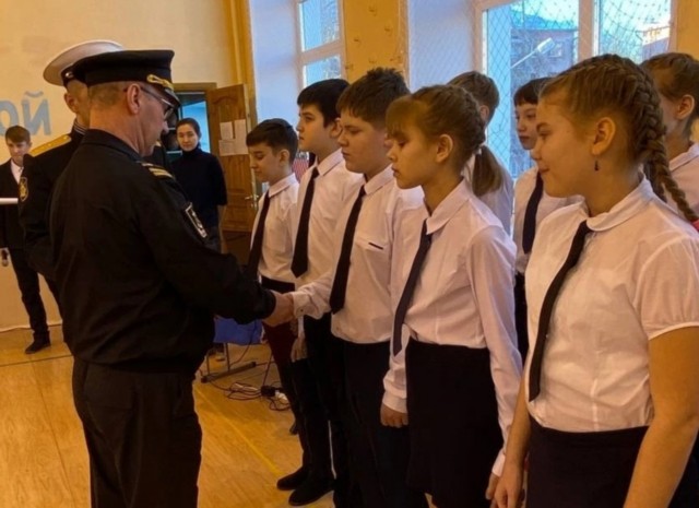 Каждому пятикласснику, после слов клятвы, вручили шиврон старший помощник капитана Ващук А.К. и старший мичман Петренко А.А.